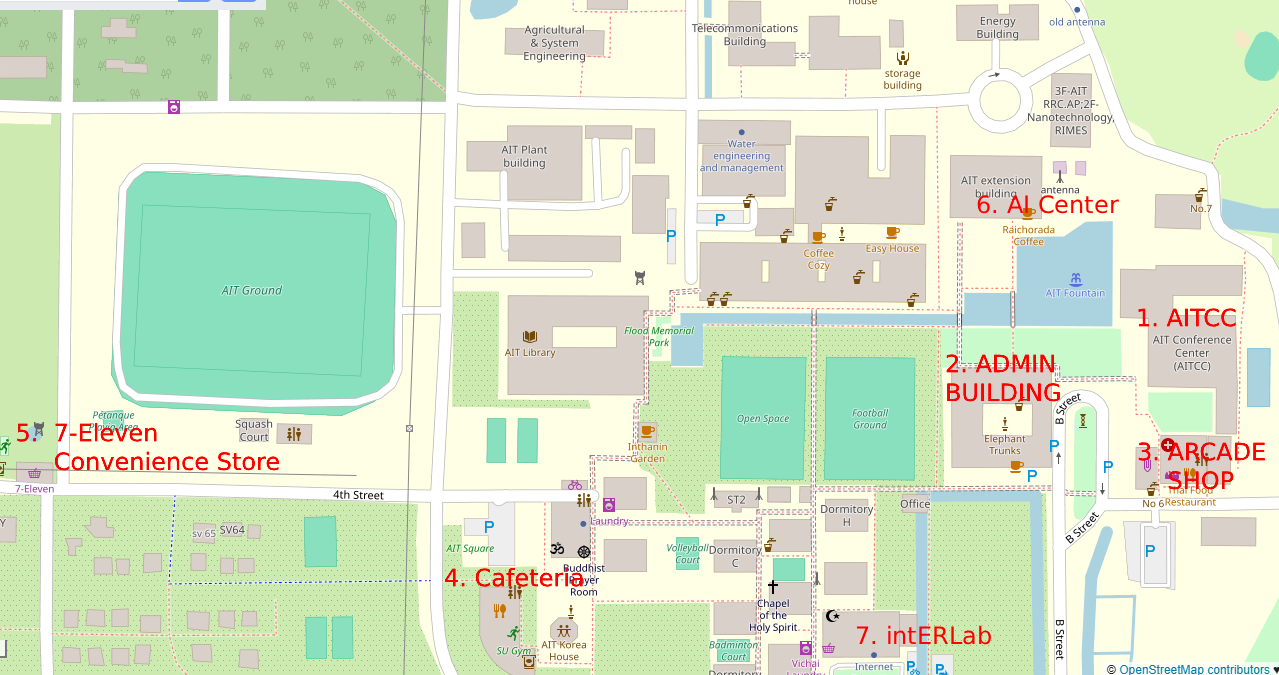 Please refer to the campus map below for key locations such as the conference center, accommodation, and dining areas within AIT.