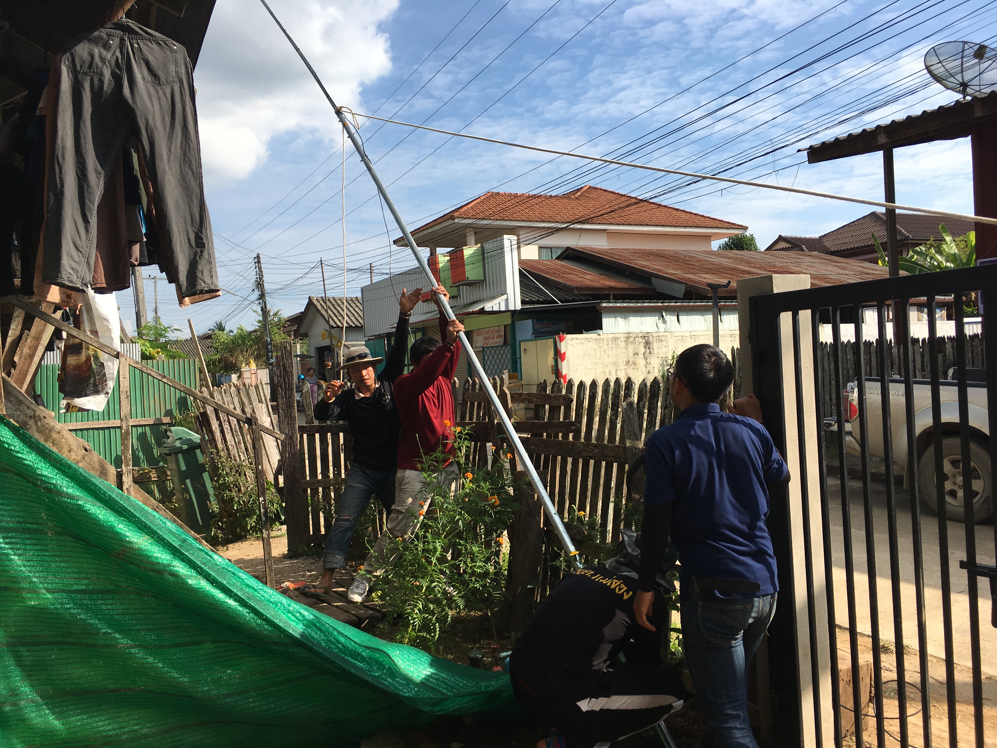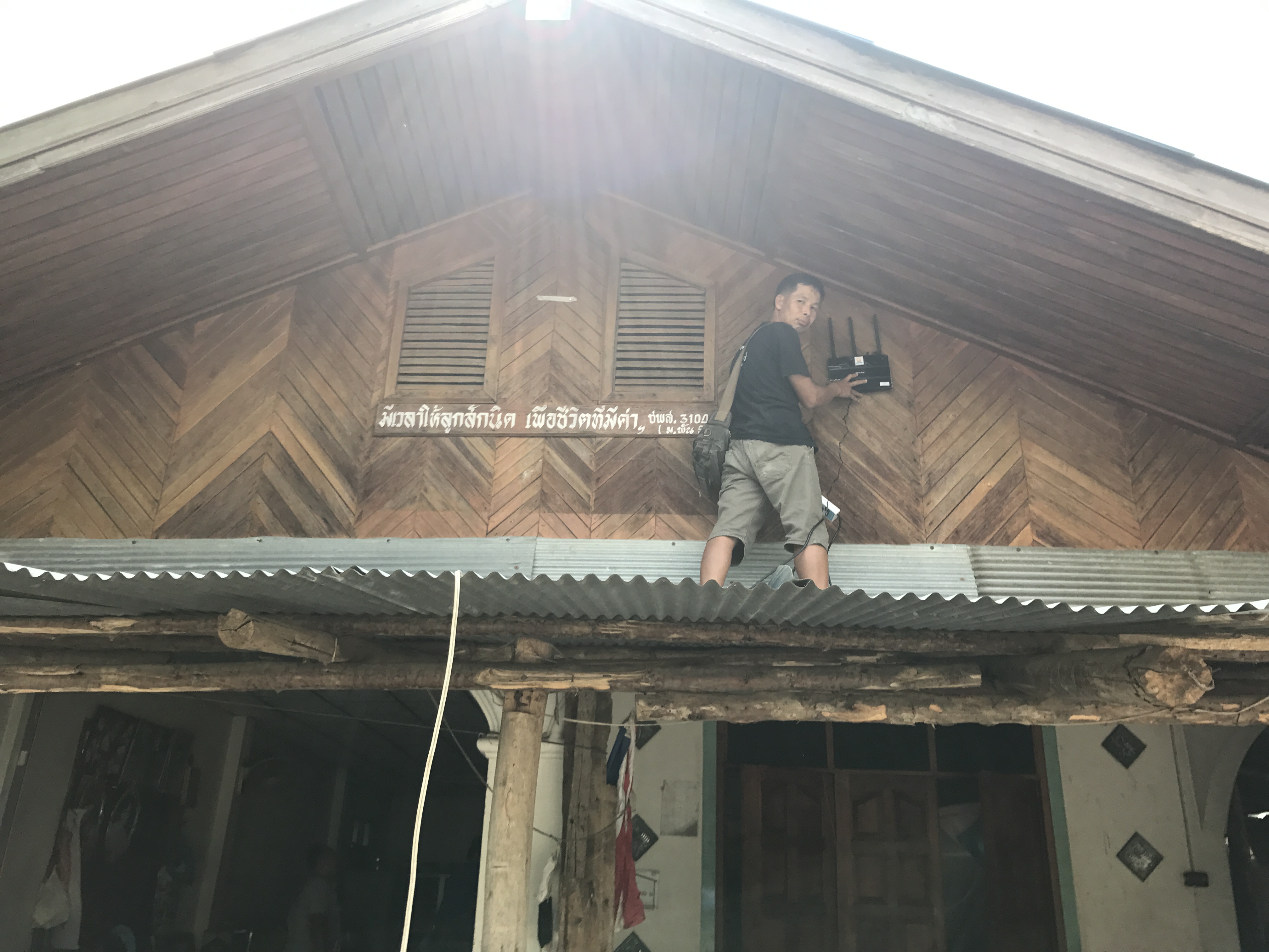 A rural community wireless mesh network. A local technician is measuring WiFi signal on the roof at Moo 1, Mae Kasa.